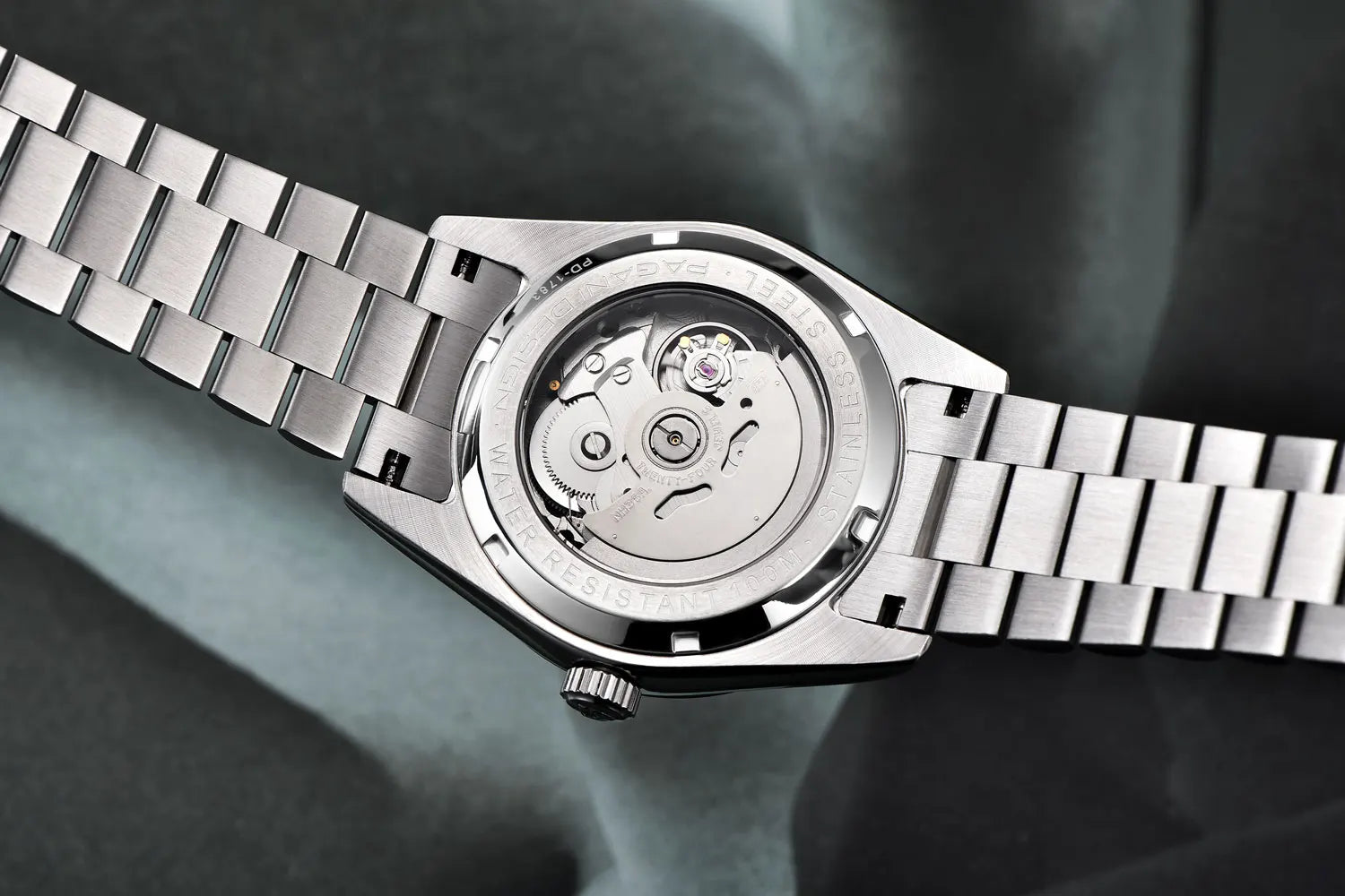 Equipado con el calibre japonés TMI NH36A, este reloj ofrece una experiencia mecánica de máxima fiabilidad, con: